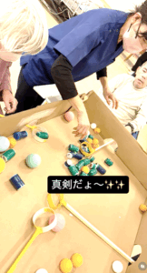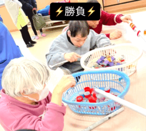 何個とれるか競争、色でそろえる競争、棒に何本入れられるか競争、いろんな遊びができるね。