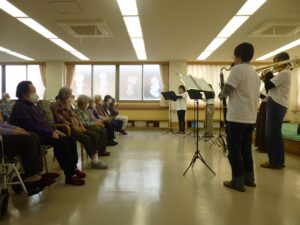 フルートやトランペット、トロンボーンとバスクラリネットの6人での生演奏を楽しみました。